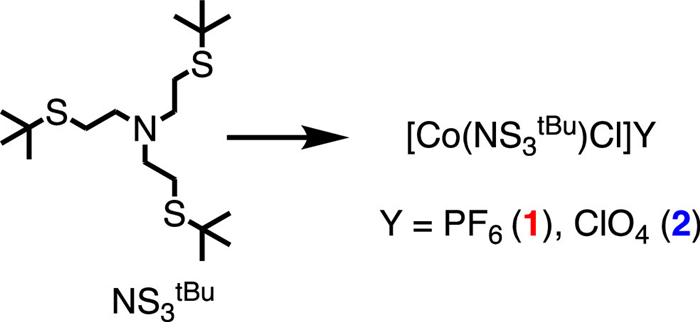 The syntheses of ligand NS3tBu, as well as compounds 1 and 2 were represented in Scheme 1. The one pot reaction NS3tBu, and related cobalt(Ⅱ) salts with related [Bu4N]PF6 or [Bu4N]ClO4 in nBuOH/EtOH mixture afforded the mononuclear complex that adopts the trigonal bipyramidal topology, with the one negative charge counter-balanced by the PF6– or ClO4– anion (Scheme 1). It should be mentioned that in the third step of synthesis of NS3tBu, the tert–Butylmercaptan used is a very poisonous gas with an obnoxious odor, and all procedures must be carried out in an efficient fume hood. The apparatus must be connected to a series of washing bottles charged with chromic acid mixture or other absorbing solutions [32].