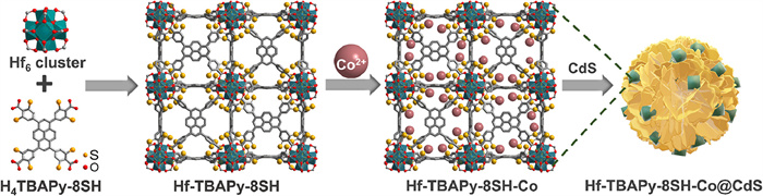 | Fig. 1. Preparation scheme for Hf-TBAPy-8SH–Co@CdS composites (color: Hf, green; C, grey; O, red; S, yellow). | |
