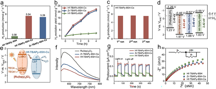 | Fig. 3. (a) Rate of photocatalytic H2 evolution of Hf-TBAPy-8SH and Hf-, Zr-TBAPy-8SH–Co catalysts bearing different transition metal upon visible LED irradiation. (b) H2 production of Hf-TBAPy-8SH and Hf-, Zr-TBAPy-8SH–Co over 4 h. (c) Three cycles of photocatalytic H2 evolution experiments of Hf-TBAPy-8SH–Co. (d) Band structures of [Ru(bpy)3]Cl2, Hf-TBAPy-8SH and Hf-, Zr-TBAPy-8SH–Co. (e) Schematic energy-level diagram showing electron transfer from [Ru(bpy)3]Cl2 to Hf-TBAPy-8SH–Co upon photoexcitation. (f) Steady-state photoluminescence spectra (λex = 550 nm) of [Ru(bpy)3]Cl2 upon addition of Hf-, Zr-TBAPy-8SH–Co. (g) Photocurrent responses of EIS of Hf-TBAPy-8SH and Hf-, Zr-TBAPy-8SH–Co. (h) Nyquist plots of EIS of Hf-TBAPy-8SH and Hf-, Zr-TBAPy-8SH–Co. | |