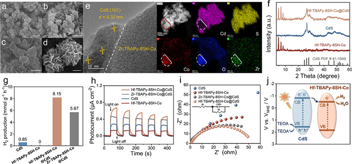 | Fig. 4. SEM images of (a) Hf-TBAPy-8SH–Co, (b) Zr-TBAPy-8SH–Co@CdS, (c) Hf-TBAPy-8SH–Co@CdS, and (d) CdS. Scale bar: 500 nm in (a, d) and 200 nm in (b, c). (j) HRTEM images and STEM-EDS elemental mapping (Cd, purple; S, yellow; Co, red; O, blue; Zr, green) of Zr-TBAPy-8SH–Co@CdS. (f) PXRD patterns of CdS, Hf-TBAPy-8SH–Co and Hf-TBAPy-8SH–Co@CdS 1:1. (g) H2 production of Hf-TBAPy-8SH–Co, CdS and Hf-, Zr-TBAPy-8SH–Co@CdS over 4 h. (h) Photocurrent responses of Hf-TBAPy-8SH–Co, CdS and Hf-, Zr-TBAPy-8SH–Co@CdS. (i) Nyquist plots of EIS of Hf-TBAPy-8SH–Co, CdS, Hf-, Zr-TBAPy-8SH–Co@CdS. (j) Illustration showing the excitons dissociation and transfer in the Hf-TBAPy-8SH–Co@CdS heterostructure under visible-light irradiation. | |
