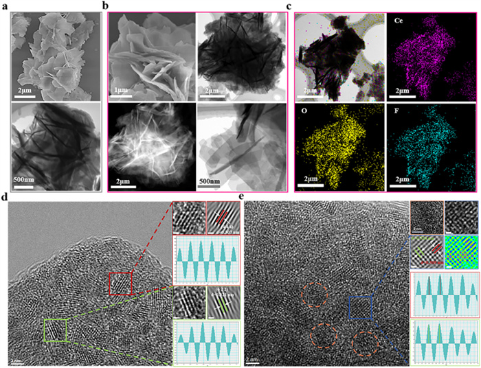 | Fig. 2. SEM and TEM images for (a) Ce-UiO-66-F and (b) Ce-UiO-66-F-200. EDS elemental mapping images of (c) Ce-UiO-66-F-200. HR-TEM images of (d) Ce-UiO-66-F and (e) Ce-UiO-66-F-200. | |