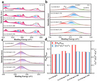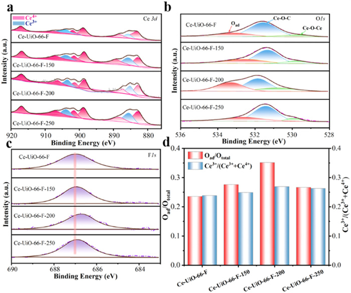 | Fig. 4. (a) Ce 3d, (b) O 1s, (c) F 1s XPS, the ratio of Oad/Ototal and Ce3+/(Ce3++Ce4+) of the Ce-UiO-66-F and (d) active Ce-UiO-66-F-X catalyst. | |