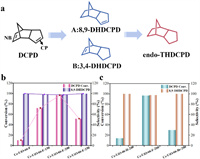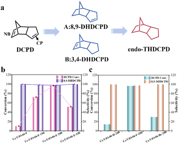 | Fig. 5. (a) Reaction pathways for hydrogenation of DCPD to endo-THDCPD. Conversion and selectivity for (b) Ce-UiO-66-F-X and (c) Ce-UiO-66-H/Br-X. | |