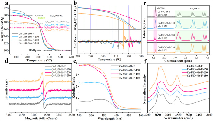 Ce-UiO-66-F's typical thermogravimetric (TGA) plot illustrates three key stages. Desolvation, which typically takes place at temperatures below 150 ℃, is the process of removing water molecules from the porous structure. The second step corresponds to the removal of structural water molecules, partially compensated ligands and linked ligands in the temperature range of about 150–300 ℃. In the final step, the organic ligands of the Ce-MOF are completely decomposed, ultimately yielding CeO2 (Figs. 6a and b). To exclude the possibility of metal cluster loss, we conducted elemental content testing on the samples, which revealed that the metal content remained almost unchanged after thermal decomposition (Table S3 in Supporting information). The ideal Ce-UiO-6-F is defect-free in the absence of auxiliary ligands competing for coordination, and all Ce nodes are fully coordinated. The molecular weight ratio of the six BDC-F linkers to CeO2 is 96/100, and the chemical formula in the fully desolvated state should be Ce6O6(BDC-F)6. However, the addition of formic acid competing ligand resulted in Ce6O6+x(BDC-F+HCOO)6-x [51,52]. Based on the nuclear magnetic resonance (NMR) results of Ce-UiO-66-F showing HCOOH: BDC-F = 0.315, the ideal molecular formula can be calculated to be Ce6O6.25(BDC-F)4.37(HCOO)1.38. The ligand connectivity of Ce-UiO-66-F synthesized at room-temperature is 11.5, which is less than the perfect 12 linkage number, corroborating the reports of low-temperature-induced defects. Given that TGA demonstrates that the Ce6 node is less connected than the ideal structure, the number of connections of the samples after pyrolysis treatments at 150, 200, and 250 ℃ were calculated to be 9.88, 8.44 and 7.92, respectively, based on the ratios of the ligand decomposition content to the residual CeO2 as well as the NMR data (Fig. 6c). As a representative, the molecular formula of Ce-UiO-66-F-200 can be calculated to be Ce6O7.78(BDC-F)3.98(HCOO)0.30, showing that mainly 80% of the formic acid molecules competing for coordination are removed from the coordination structure of the inorganic node after thermal activation at 200 ℃.