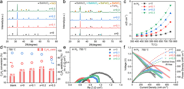 In conclusion, double perovskite catalysts (PrBa)0.95(Fe1-xNix)1.8Mo0.2O6-δ (PBFNMx, x from 0 to 0.3) were developed and studied for co-generation of electricity and C2H4 by C2H6 dehydrogenation in PBFNMx-impregnated BaZr0.1Ce0.7Y0.2O3 (BZCY) anodes of proton-conducting solid oxide fuel cells. Based on the experimental results, the following conclusions are drawn: (1) FeNi3 nanoparticles exsolve from PBFNMx in H2 and uniformly distribute on the double perovskite substrate, promoting C2H6 dehydrogenation and enhancing the electrochemical performance of the anode; (2) PBFNMx with a Ni content of 0.2 (PBFNM0.2) exhibits the highest C2H6 dehydrogenation activity and electrochemical performance; (3) The ideal impregnation amount of PBFNM0.2 in the anode is 30 wt%, resulting in the lowest impedance and highest power density of an anode-supported cell with increased C2H4 yield; (4) The cell performance degrades due to carbon deposition and FeNi3 particles coarsening and recovers significantly after oxidative regeneration.