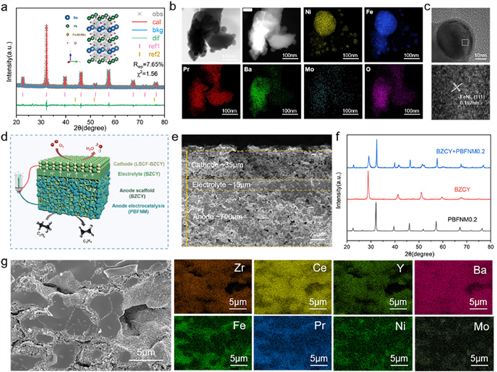 | Fig. 3. Characterizations of reduced PBFNM0.2 and structure of anode-supported cell: (a) Rietveld refinement; (b) TEM-EDS examination of reduced PBFNM0.2; (c) HRTEM examination of the exsolved nanoparticles; (d) Design and (e) SEM observation of anode-supported cell; (f) XRD patterns showing compatibility between PBFNM0.2 and BZCY at 1100 ℃ for 2 h; (g) SEM-EDS examination of 30 wt% PBFNM0.2-impregnated BZCY anode. | |