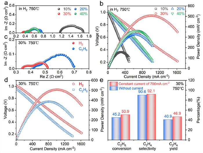 | Fig. 4. Performances of PBFNM0.2-BZCY anode-supported cells: (a) Impedance profiles and (b) I-V-P curves of cells with various amounts of PBFNM0.2 in anodes (H2 fuel, 750 ℃); (c) Impedance profiles and (d) I-V-P curves of cell with 30 wt% PBFNM0.2 in anode (H2 and C2H6 fuels, 750 ℃); (e) Composition of anode products of cell with 30 wt% PBFNM0.2 in anode with and without an applied current of 700 mA/cm2. | |