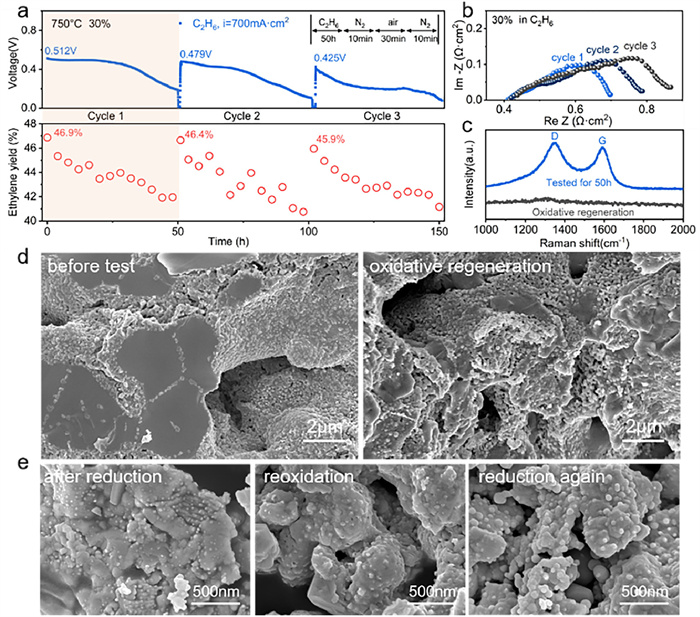 | Fig. 5. Performance (C2H6 fuel) and oxidative regeneration of cell with a 30 wt% PBFNM0.2-impregnated anode and PBFNM0.2 morphology change: (a) Time dependence of cell voltage at 0.7 A/cm2 and C2H4 yield; (b) Cell's impedance profiles at beginning of each cycle; (c) Raman spectra before and after first oxidative regeneration; (d) Cross-sectional microstructures of anode before first 50-h test and after first oxidative regeneration; (e) Morphologies of reduced (in H2 for 2 h and 0.5 h again after in air for 0.5 h) and oxidized (in air for 0.5 h) PBFNM0.2 at 800 ℃. | |