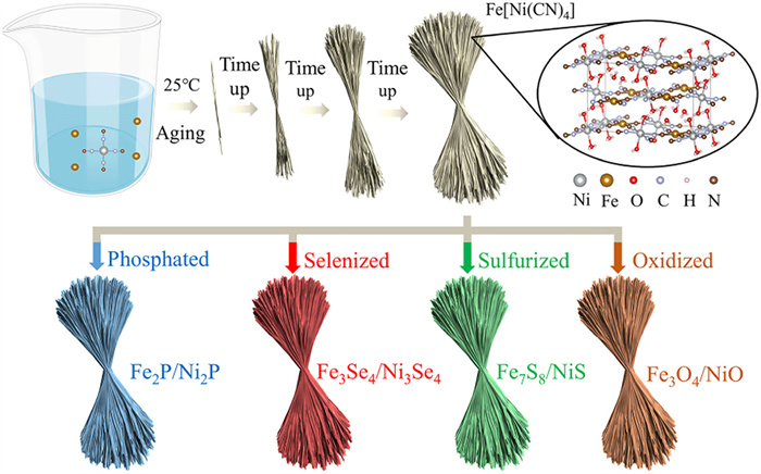 Herein, the FeNi HCP was selected as a precursor to synthesize a series of FeNi-based materials (FeX/NiX, X = P, Se, S, and O) [60-65]. The fabrication routine of the superstructure and its derivations is schematically shown in Fig. 1. Polyvinylpyrrolidone (PVP) was used as a surfactant to synthesize Fe[Ni(CN)4] nanowire self-assembled superstructure (Fe-Ni HCPS), then anion-modified catalysts were obtained through phosphating, selenizing, sulfurizing, and oxidizing treatments. The electronic structure, redox process, and OER catalytic mechanism show that substitution with less electronegative anions leads to an increase in electron density around the metal atoms, causing a transfer of binding energy. Based on DFT calculations, we found that anions with lower electronegativity improve the metallicity of the catalyst to increase conductivity and optimize the adsorption behavior of oxygen intermediates, thereby improving OER electrocatalytic activity. As an OER electrocatalyst, the FeNi selenide exhibits enhanced activity and stability compared with commercial RuO2 at a high current density.