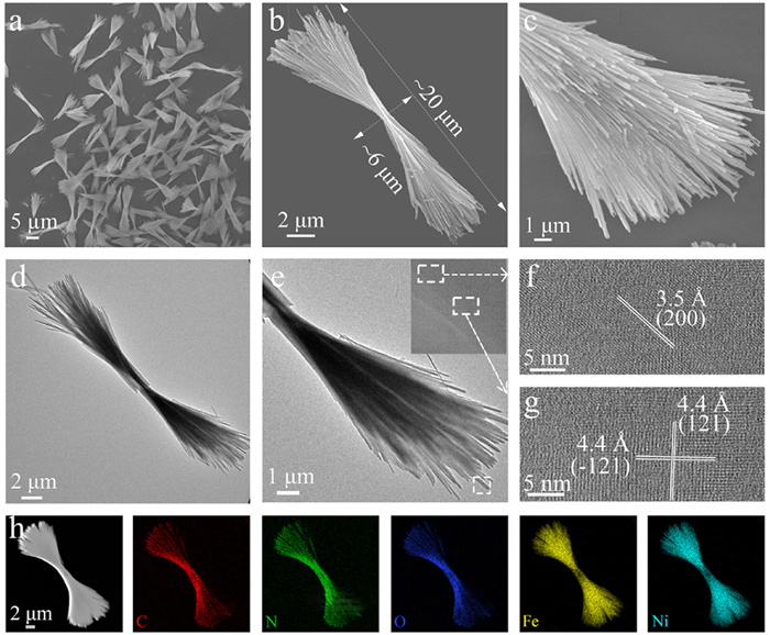 The phase composition of the Fe[Ni(CN)4] nanowire self-assembled superstructure (FeNi HCPS) was confirmed by X-ray diffraction (XRD) analysis (Fig. S1a in Supporting information). All diffraction peaks are well-matched with the reported Fe(H2O)2[Ni(CN)4]·H2O bulk phase. From Fourier transform-infrared (FT-IR), it can see the existence of −C≡N (2156.1 cm−1), Ni−C≡N (581.4 cm−1), and Fe-N (621.3 cm−1) signal peaks (Fig. S1b in Supporting information). The above characterization proves that the preparation of the samples is indeed FeNi HCPs. Energy dispersive spectrometer (EDS) can be seen that the sample contains C, N, O, Fe, and Ni elements, and no other impure elements were detected (Fig. S1c in Supporting information). FT-IR and EDS spectra further prove the composition of the product is FeNi HCPS. The morphology of the as-prepared FeNi HCP is characterized by field-emission scanning electron microscopy (FESEM) and transmission electron microscope (TEM). Figs. 2a and b show high uniformity of the FeNi HCPS, which is composed of nanowires, with a length of ~20 µm. From Fig. 2c, it shows that the shape is composed of wires. The forming process is to first superimpose new wires irregularly on the wire. As the wires become longer, more and more wires are superimposed, making the FeNi HCPS continue to grow longer and wider until it is stable (Fig. S2 in Supporting information). FeNi HCPS can be observed in the transmission electron microscope (TEM) images (Figs. 2d and e), and it can be seen that the middle is thicker than both sides, proving the superimposed growth of FeNi HCP nanowires. The high-resolution TEM (HRTEM) image of the clear lattice fringes (Fig. 2f). The interplanar spacings of 3.5 and 4.4 Å correspond to the (200) and (121) planes, respectively (Fig. 2g). The scanning transmission electron microscopy (STEM) images and corresponding elemental mapping confirm the homogeneous distribution of C, N, O, Ni, and Fe elements within FeNi HCPS (Fig. 2h). Further, the XPS spectra results verify the presence of elements in FeNi HCPS, according to Fe 2p XPS spectra, in which part of the Fe2+ is oxidized to Fe3+, C 1s XPS spectra and N 1s XPS spectra can be seen that FeNi HCPS has C≡N, (Fig. S3 in Supporting information). We conducted a preliminary exploration of the formation reasons of FeNi HCPS. The effect of NH4+ on the superstructure is excluded (Fig. S4 in Supporting information). Two additional experiments were performed to verify that oxidation of Fe2+ to Fe3+ was the reason for the superstructure formation: The first one was synthesized with (NH4)2Fe(SO4)2 and Fe2(SO4)3, and the superstructure still existed (Fig. S5 in Supporting information); while the other one was synthesized with only Fe2(SO4)3 without superstructure appearing (Fig. S6 in Supporting information). Such results confirm that the presence of Fe2+ and Fe3+ is crucial for uniform superstructure formation. Moreover, citrate was regarded as an additive in tuning the morphology of the superstructure: The size becomes thicker and shorter when lowering the dosage of citrate (Fig. S7 in Supporting information). In contrast, the size would be longer and thinner because an overdose of citrate triggers the formation of Fe2+-citrate complex which leads to a decrease in the nucleation rate.