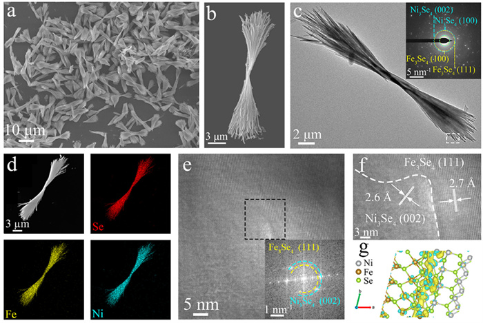 | Fig. 3. (a, b) FESEM and (c) TEM image (inset: the corresponding SAED image), (d) STEM image and the corresponding elemental mapping images, (e) HRTEM image (inset: the corresponding FFT) and (f) enlarged image from the dot line rectangle in (e) of the Fe3Se4/Ni3Se4. (g) Distribution of the charge density difference at Fe3Se4/Ni3Se4 heterointerfaces, in which yellow and blue represent positive and negative electronic clouds, respectively. | |