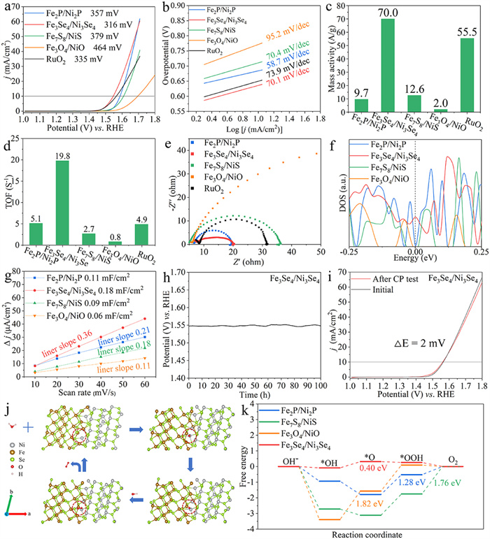 | Fig. 4. (a) LSV curves, (b) Tafel plots, (c) Mass activities, (d) TOF, (e) EIS curves, (f) DOS, and (g) ECSA curves of the Fe3Se4/Ni3Se4 and other catalysts. (h) CP test of the Fe3Se4/Ni3Se4 catalyst at the current density of 10 mA/cm2. (i) LSV curves of the Fe3Se4/Ni3Se4 after CP test. (j) Schematic illustration of the proposed OER pathways on the Fe3Se4/Ni3Se4 catalyst. (k) Calculated energetic reaction pathway for the OER process on the surface of the Fe3Se4/Ni3Se4 and other catalysts. | |