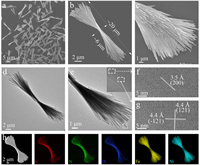 | Fig. 2. (a–c) FESEM images and (d, e) TEM images of the Fe[Ni(CN)4]. (f, g) HRTEM image of the Fe[Ni(CN)4] in (e). (h) STEM images and the corresponding elemental mapping images of a Fe[Ni(CN)4]. | |