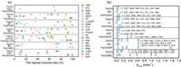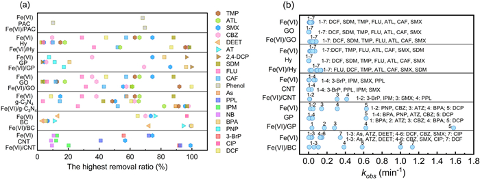 | Fig. 1. (a) The highest efficacy of carbon materials (CMs), ferrate [Fe(Ⅵ)], and Fe(Ⅵ)/CMs systems for relevant pollutants degradation. (b) Determined reaction rate constants of relevant pollutants in CMs, Fe(Ⅵ), and Fe(Ⅵ)/CMs systems. Data were derived from Table S2 (Supporting information). | |