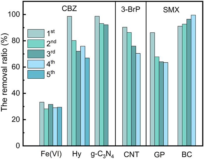 The repeatability of GP, CNT, and Hy demonstrates a diminishing trend after undergoing four or five cycles (Fig. 10). The efficiency of micro-pollutants removal in the Fe/GP, Fe/CNT, and Fe/Hy systems consistently remained higher compared to that of the Fe(Ⅵ) process after undergoing four or five reaction cycles. This observation suggests that integrating used GP, CNT, and Hy with Fe(Ⅵ) offers a sustainable solution for remediating micro-pollutants [41,54–56,59,106]. Based on the findings, it was observed that recycled CMs possess the capability to continuously generate reactive Fe(Ⅳ)/Fe(Ⅴ) species or •OH in the presence of Fe(Ⅵ). Among these seven CMs, only BC exhibited an enhanced removal rate of pollutants upon reuse. This observation underscores the promising potential of Fe(Ⅵ)/BC system in practical engineering applications, offering a cost-effective solution.