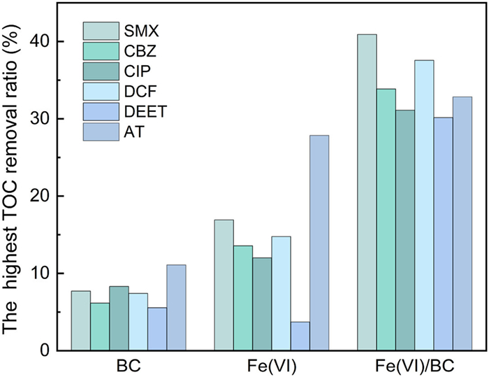 | Fig. 2. The highest total organic carbon (TOC) removal ratios of relevant pollutants by biochar (BC), Fe(Ⅵ), and Fe(Ⅵ)/BC systems. Data were derived from Table S2. | |