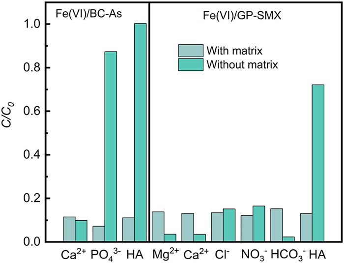 Additionally, in order to investigate the impact of natural organic matter (NOM) on the degradation process in water [76], researchers conducted an examination on the influence of humic acid (HA) on pollutants removal [77]. The findings consistently demonstrated a relatively low efficiency of approximately 16% for As removal, even when varying concentrations of HA ranging from 0 to 2 mg C/L were considered (Fig. 3). Furthermore, it was observed that the increase in HA concentration led to a decrease in the removal efficiency of As [78]. The presence of HA was found to effectively impede the degradation of As in the Fe(Ⅵ)/BC system. The presence of HA enhanced the SMX removal rate by approximately 60% in the GP/Fe(Ⅵ) system, and this constraint became more pronounced with increasing HA dosage. Here, these results can be attributed to two factors: (1) HA, as a representative organic compound in water, exhibits competitive behavior with SMX towards active species; (2) Reducing components such as quinones and phenols present in hyaluronic acid may further facilitate the conversion of Fe(Ⅳ) and Fe(Ⅴ) to Fe(Ⅱ) and Fe(Ⅲ), consequently reducing the concentration of active oxidants [79].