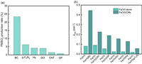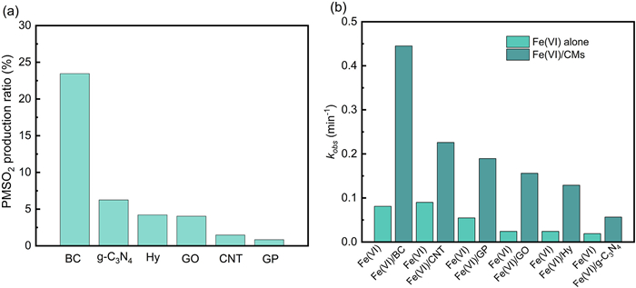 | Fig. 4. (a) The production rate of methyl phenyl sulfone (PMSO2) was investigated in different ferrate [Fe(Ⅵ)]/carbon materials (CMs) systems, with each quality of CMs being examined. (b) A comparison between the determined reaction rate constants for the production of PMSO2 in the Fe(Ⅵ) system and the Fe(Ⅵ)/CMs systems. Data were derived from Table S4 (Supporting information). | |