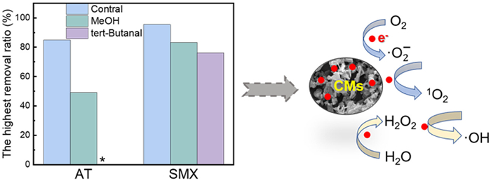 | Fig. 5. Oxidation of AT and SMX by ferrate/biochar with methanol (MeOH) or tert–butanol. Plausible radical species in ferrate/carbon materials systems. Data were derived from Table S5 (Supporting information). | |
