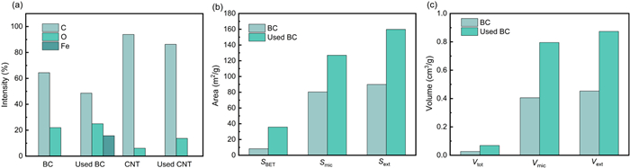 | Fig. 7. (a) The determination of atomic concentration and chemical state in both initial carbon materials as well as exhausted carbon materials. (b) The comparison of surface area between the original biochar (BC) and the utilized BC. (c) The changes in pore volume between the initial BC and the used BC. Data were derived from Table S6 (Supporting information). | |