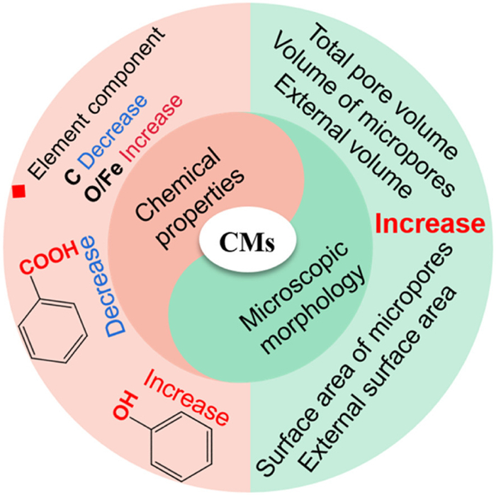 The combination of CMs with Fe(Ⅵ) systems has been previously demonstrated to enhance the efficiency of micro-pollutants removal, accelerate rates of mineralization, and mitigate environmental impact [64]. The surface active functional groups of CMs can facilitate the generation of increased amounts of Fe(Ⅳ)/Fe(Ⅴ) from Fe(Ⅵ), thereby promoting the degradation of micro-pollutants. Following the reaction, there is also an observed increase in both the surface area and void volume of CMs, leading to enhanced adsorption capacity for micro-pollutants [65].