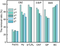 | Fig. 10. The reusability effectiveness of ferrate and diverse carbon materials for the treatment of various pollutants. Data were derived from Table S6 (Supporting information). | |