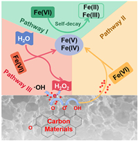 Due to the sluggish rate of Fe(Ⅳ)/Fe(Ⅴ) production from Fe(Ⅵ) alone, enhancing the activation of Fe(Ⅵ) is pivotal for improving the oxidation capacity in the Fe(Ⅵ) system. Consequently, numerous strategies have been proposed by researchers to activate Fe(Ⅵ), thereby promoting the generation of Fe(Ⅳ)/Fe(Ⅴ) [32]. Different approaches can be employed to enhance the generation of Fe(Ⅳ)/Fe(Ⅴ) from Fe(Ⅵ), such as acidic substances (e.g., hydrochloric acid), metal ions (e.g., Fe(Ⅲ)), carbon materials (CMs), reducing agents [32-35].