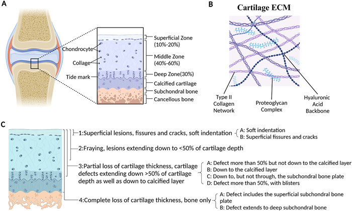The primary functions of articular cartilage are to absorb impact, prevent friction between adjacent joints, and maintain low-friction surfaces [19,20]. Comprising up to 80% water, articular cartilage lacks blood vessels, nerves, and lymphatic vessels, consisting solely of chondrocytes and ECM [2,19,21]. Chondrocytes, the specialized cells of mesenchymal origin, make up only 2% of the tissue's volume and exhibit minimal proliferation [19,20]. These cells are responsible for producing and maintaining the ECM by secreting enzymes, growth factors, and inflammatory mediators [20,22]. As shown in Fig. 4, the ECM is predominantly composed of type Ⅱ collagen (Col Ⅱ), proteoglycans, and hyaluronic acid (HA), providing cartilage with its structure and biomechanical properties, such as compressive stiffness, elasticity, and shear resistance (Fig. 4B) [19,21,23]. Cartilage tissue is classified into three types: elastic cartilage, fibrocartilage, and hyaline cartilage, the latter being the primary component of articular cartilage. Normal articular cartilage is divided into four distinct zones: superficial, middle, deep, and calcified, with tide mark separating it from the subchondral bone (Fig. 4A) [2,20]. Cartilage defects were classified into 4 grades according to the depth of the cartilage defect (Fig. 4C) [24].
