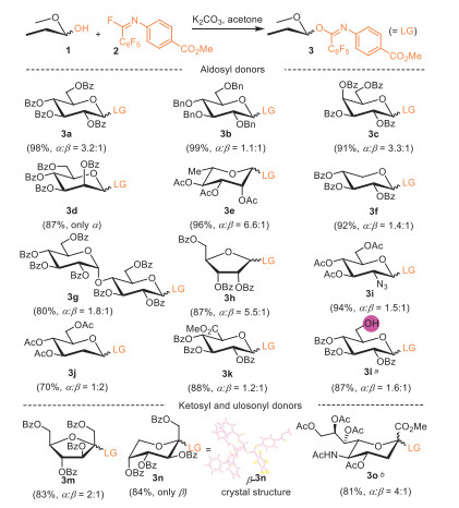 Unlike PTFA donor, which exhibits a miscellaneous configuration of the carbon-nitrogen double bond at ambient temperature, PPFB donors displayed clean 1H NMR spectra (Supporting information). The crystal structure of the frucotopyranosyl donor (β−3n, CCDC 2376950, Scheme 1) further confirms that the N-phenyl group is oriented syn to the pentafluophenyl group while anti to the bulky sugar moiety. Interestingly, the N-phenyl group lies within the plane of imidate (O–C=N), distinguishing it from that of PTFA donor [37]. Instead, the pentafluophenyl group is positioned perpendicular to this plane, likely due to favorable π-π stacking interaction with N-phenyl group. This structural elucidation highlights the structural clarity of the PPFB donors.