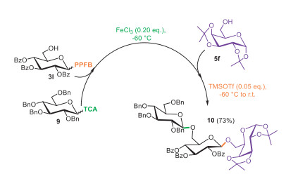 With the optimized selective promotion condition and the already available bifunctional building block (3l), we investigated the fully catalytic one-pot synthesis by combining imidates TCA and PPFB (Scheme 3). The first glycosylation reaction between TCA donor (9) and bifunctional intermediate (3l) proceeded smoothly, yielding β-disaccharide under the promotion of FeCl3 (0.2 equiv.) at −60 ℃ [47]. After approximately 0.5 h, once the donor (9) was fully consumed, acceptor (4f) and TMSOTf (0.05 equiv.) were added to the reaction mixture. The second glycosylation went complete within an additional hour during which the reaction was allowed to warm to ambient temperature. Finally, trisaccharide (10) was isolated with an overall yield of 73%. Mass spectrum analysis suggested that the lower yield was ascribed to the partial activation of PPFB donor during the first glycosylation. This synthesis demonstrates the practicality of PPFB donors in a fully catalytic one-pot synthesis. Future work will focus on further optimizing the promotion conditions, including organocatalysis [49] or transition metal catalysis [50,51] that have proven successful for imidate donors. Additionally, new chemical entities will be further introduced and refined to enhance the reactivity differential, thereby improving overall efficiency and yield.