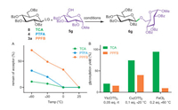 | Fig. 3. Reactivity comparison of imidates. (A) Activation profiles of imidates (8, 4, and 3a) under TMSOTf (0.05 equiv.) promotion at various temperatures. Imidate activity was inversely correlated with the remaining amount of acceptor (5g), as quantified from integration of 1H NMR spectra. (B) Glycosylation efficiency of imidates (8 and 3a) with acceptor (5g) under different promotion conditions. Yields were determined from 1H NMR spectra. | |
