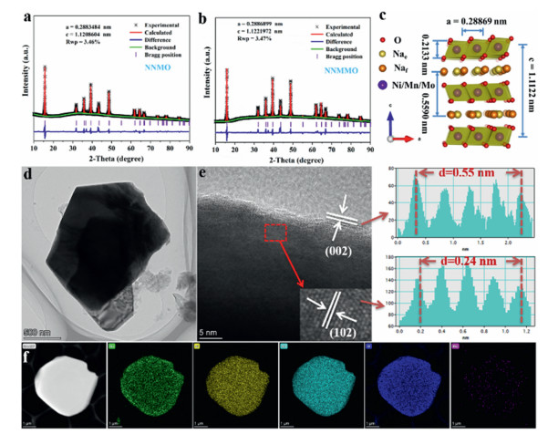 | Fig. 1. Structural characterization of NNMO and NNMMO. (a, b) Rietveld refinement patterns of NNMO and NNMMO. (c) Schematic diagram of the crystal structure of NNMMO. (d, e) TEM and HRTEM images of NNMMO. (f) EDS mapping images of NNMMO. | |
