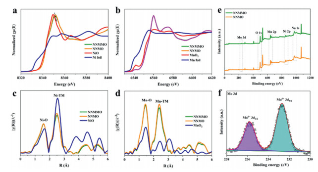 | Fig. 2. XAFS characterization of NNMO and NNMMO. (a, b) Ni, Mn K-edge XANES spectra. (c, d) Corresponding Ni, Mn K-edge EXAFS spectra. (e) XPS survey spectra. (f) Mo 3d XPS spectrum of NNMMO. | |