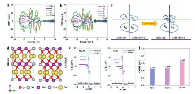 | Fig. 4. Theoretical investigations on the effect of Mo-doping in NNMO. (a) Total density of states (DOS) for NNMO and (b) NNMMO cathode. (c) Schematic pDOS of NNMO and NNMMO. (d) The optimized structures of NNMO and NNMMO. (e) Comparison of COHP values of Ni-O and Mn-O bonds after Mo-doping. (f) COHP results of NNMMO. | |