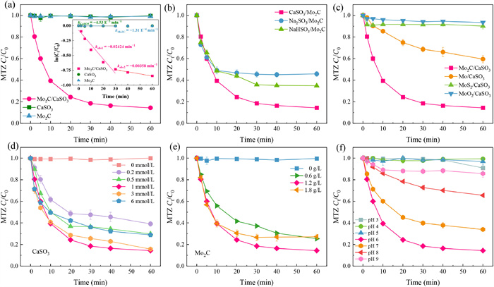 | Fig. 1. (a) MTZ removal and corresponding pseudo first-order kinetic by diverse processes. (b) Comparison of MTZ degradation by Mo2C activate different sulfites. (c) CaSO3 activation by different Mo−based materials for MTZ elimination. Effect of CaSO3 concentration (d), Mo2C dosage (e), and buffered pH solution (f) on MTZ decomposition. Conditions: [CaSO3]0 = [Na2SO3]0 = [NaHSO3]0 = 1 mmol/L, [Mo2C]0 = [Mo]0 = [MoS2]0 = [MoO2]0 = 1.2 g/L, pH 6. | |