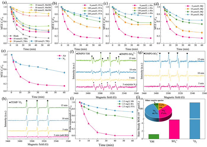 | Fig. 2. Quenching experiments at pH 6: (a) MeOH and TBA, (b) FFA, (c) l-His, (d) BQ. Effect of passing N2 on MTZ degradation (e). DMPO-trapped ESR (f, g). TEMP-trapped ESR (h). Decomposition of NB, BA and FFA within Mo2C/CaSO3 (i). Steady-state concentrations and contribution of ROS (j). Conditions: [CaSO3]0 = 1 mmol/L, [Mo2C]0 = 1.2 g/L, [MTZ]0 = 5 mg/L, pH 6. | |