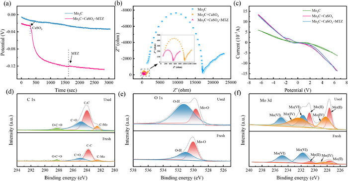 | Fig. 3. Electrochemical tests of Mo2C/CaSO3: (a) OCP curve, (b) Nyquist plots, (c) CV curves. XPS profiles of pristine and used Mo2C: (d) C 1s, (e) O 1s, and (f) Mo 3d. | |