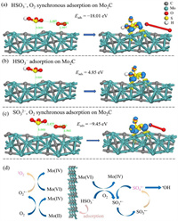 Microscopic reaction specifics involving Mo2C and CaSO3 were investigated through DFT calculations. TEM and HRTEM findings reveal a lattice stripe spacing of 0.219 nm on Mo2C (Fig. S14 in Supporting information), affirming the dominance of the (101) crystallographic facet in Mo2C. Therefore, the crystal cell was generated by sectioning the 101 crystal faces of Mo2C, and the adsorption energies (Eads) of different ions and molecules (HSO3−, SO32−, and O2) on Mo2C were computed, with detailed outcomes presented in Table S4 (Supporting information). Initially, we modeled the concurrent adsorption of O2 and HSO3− on the Mo2C surface. Fig. 4a and Fig. S15 (Supporting information) depict the adsorption of HSO3− at the Mo site and C site, respectively. The Eads at the Mo site was lower than that at the C site, both below zero, suggesting potential adsorption of HSO3− at both sites, with a higher likelihood at the Mo site. Additionally, the Eads of HSO3− when adsorbed solely at the Mo site was computed (Fig. 4b). As the Eads of HSO3− alone exceeded zero, indicating that without O2 involvement, the adsorption process could not occur spontaneously. This observation further underscored the pivotal role of O2 in HSO3− activation process and validated the findings of the earlier N2 passage experiment. Furthermore, we simulated the initial adsorption of O2 followed by the subsequent adsorption of HSO3− on the Mo2C surface (Fig. S16 in Supporting information). An Eads of HSO3− exceeding zero indicated the non-spontaneous nature of this reaction, further confirming that the prerequisite for HSO3− activation was the simultaneous adsorption of HSO3− and O2 on Mo2C surface. Fig. 4c presents the calculated Eads when SO32− and O2 were concurrently adsorbed on the Mo site. The findings revealed that the Eads of HSO3− was lower than that of SO32−, with both values being negative, suggesting that HSO3− was more inclined to be adsorbed on the Mo2C surface than SO32− for activation. This validated the rationale behind the heightened activation and MTZ degradation of S(Ⅳ) under pH 6.
