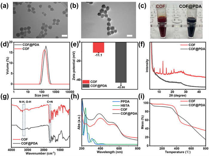 Fig. 1. The physicochemical characterization of as-prepared COF and COF@PDA. TEM images of (a) COF and (b) COF@PDA. (c) The photograph of COF (left) and COF@PDA (right) solutions. (d) DLS curves, (e) zeta potential, (f) XRD patterns, and (g) FT-IR spectra of COF and COF@PDA. (h) UV–vis spectra of monomers, COF and COF@PDA. (i) TGA curves of COF and COF@PDA. Data are presented as the mean ± SD (n = 3). Scale bar: 100 nm. |