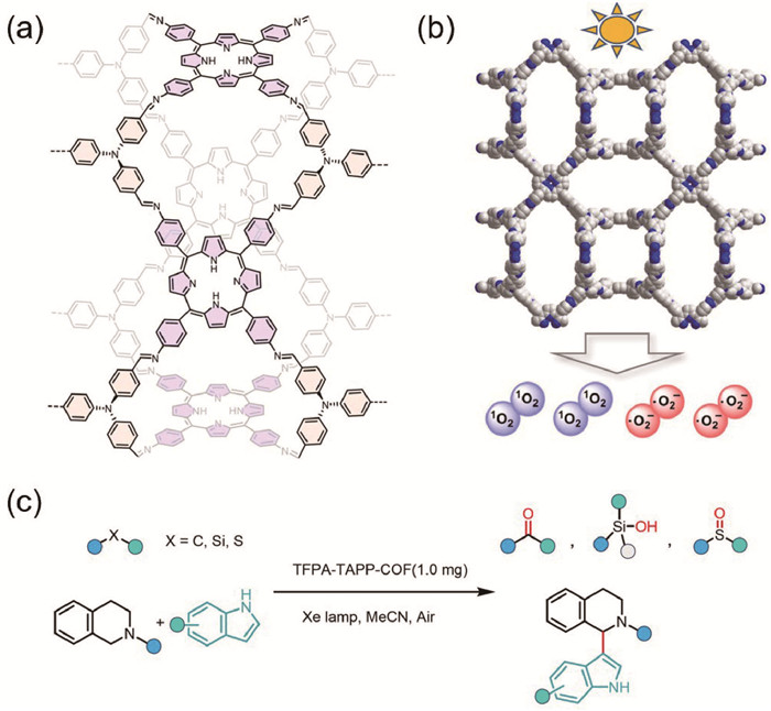 To address the ongoing challenge of developing efficient photocatalysts for various oxidation reactions, Zhao, Li, and co-workers introduced a clever approach that combines two photoactive units, triphenylamine (TPA) and porphyrin, into a single COF [4]. The new material, named TFPA-TAPP-COF (Figs. 1a and b), has a well-organized three-dimensional structure with permanent porosity, created through Schiff-base condensation. Structural and light-related tests confirmed the successful incorporation of the two chromophores, which impart the COF semiconducting properties and the ability to generate both 1O2 and O2•− when exposed to visible light. This was confirmed by electron paramagnetic resonance (EPR) measurements.