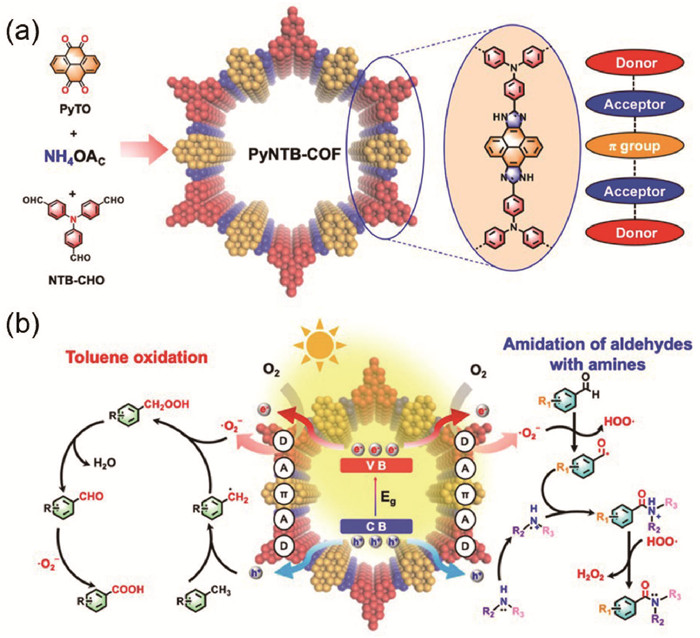 | Fig. 2. (a) Schematic diagram for the synthesis of PyNTB-COF and the formation of the D-A-π-A-D fragment. (b) Proposed mechanisms of two types of aerobic oxidation reactions photocatalyzed by PyNTB-COF. Reproduced with permission [5]. Copyright 2025, American Chemical Society. | |