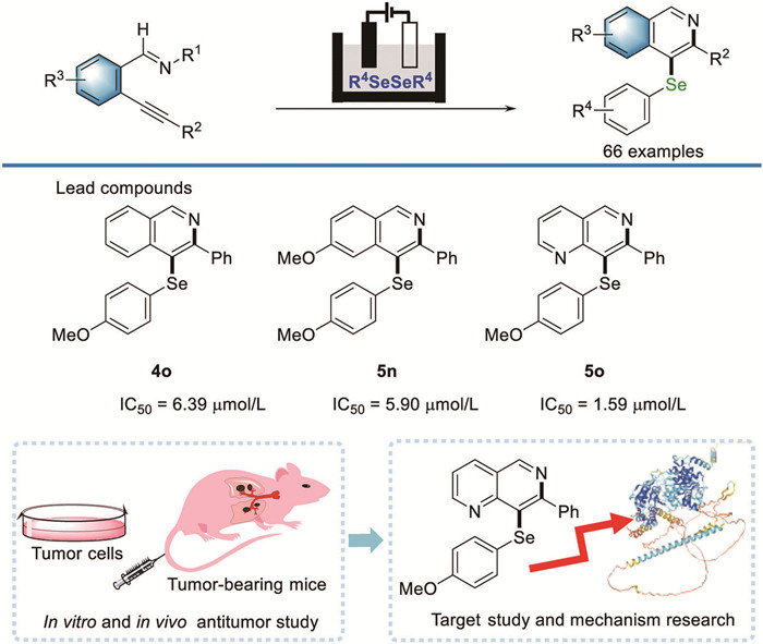 Considering the crucial role of selenium in human physiology, significant research efforts have focused on developing selenium-containing compounds for disease prevention and therapeutic applications. Notably, the synthesis of selenium-containing heterocycles, including selenoisoquinoline derivatives has emerged as a promising strategy in anticancer drug development due to their enhanced biological activity and therapeutic potential. A growing number of researchers are focusing on the synthesis of selenium-optimized compounds with demonstrated antitumor efficacy. However, the preparation of these organoselenium compounds, particularly selenoisoquinoline derivatives often necessitates multistep synthetic routes under harsh conditions, including the use of chemical oxidants, transition metal catalysts, or specialized treatments, typically requiring elevated temperatures and prolonged reaction times. Given the environmental concerns and practical limitations of conventional synthetic methods, developing green and efficient approaches for antitumor organoselenium compound synthesis has become imperative. Electrochemical synthesis offers distinct advantages, including mild reaction conditions, a high atom utilization efficiency, and environmental friendliness [2]. Accordingly, it holds vast application potential in the field of drug research and development. The research group of Zhixiong Ruan at Guangzhou Medical University has conducted continuous researches in electrochemical synthetic methodology for drug discovery [3,4].