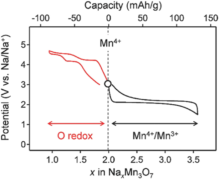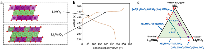 | Fig. 2. (a) Crystal structure of lithium-rich manganese-based materials. (b) Typical first-cycle charge-discharge curves of lithium-rich manganese-based cathode materials. (c) Compositional phase diagram showing the electrochemical reaction pathways for a xLi2MnO3·(1-x)LiMO2 electrode. (c) Reproduced with permission [87]. Copyright 2021, Wiley-VCH. | |
