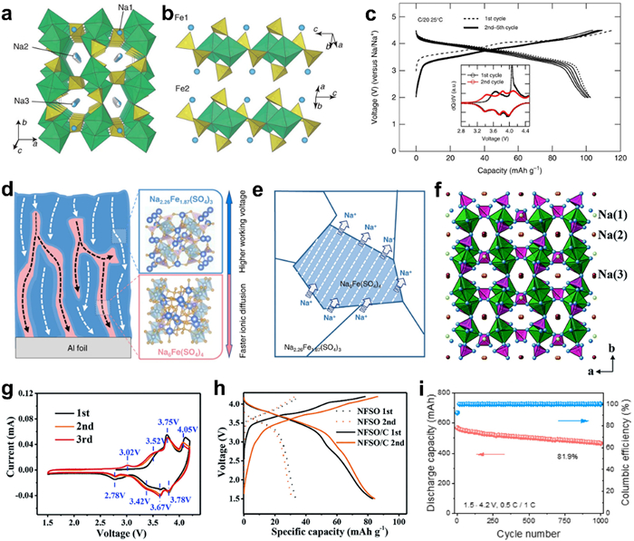 Compared to oxides, polyanionic cathodes have a diverse chemical composition and crystal structure, including sulfates, phosphates, silicates, etc. LiFePO4(LFP) with an olivine structure, has been commercialized because of their stable charge-discharge platform, economic and environmental benefits, and higher safety. To enhance their conductivity and energy density, modifications are primarily made through ion doping, surface coating, morphology control, and addition of lithium-complementary material. LiMnPO4 with LFP structural approximation has a high voltage of 4.1 V, however, their intrinsic conductivity is low. Martha et al. [120] synthesized carbon-coated LiMn0.8Fe0.2PO4 material through high-temperature solid phase reaction, which exhibited stable cycling with a capacity of approximately 165 mAh/g. Companies in China, including BYD company have begun commercializing it. The synthesis process of pure phase LiVPO4F is quite complex, this material has a higher discharge voltage of 4.2 V and excellent cycling stability, and it also has potential for application in power batteries. Kim et al. [121] reported a one-step, large scale solid-phase synthesis method for LiVPO4F. Zhang et al. [122] suppressed the formation of impurity phase Li3V2(PO4)3 through adding polyvinylidene fluoride (PVDF) as a supplemental fluorine source and conducted B–doping on the thermally decomposed carbon from PVDF to synthesize LiVPO4F material. The synthesized LiVPO4F material demonstrated a capacity of 132.9 mAh/g at a 5 C rate. Lander et al. [123] have synthesized a variety of sulfates, including fluorosulfates, hydroxysulfates, and oxosulfates as cathode materials. Among these, the triplite-structured LiFeSO4F possesses a specific capacity comparable to LFP (~150 mAh/g), and a working voltage that is 0.5 V higher than LFP (3.9 V), with better electrical conductivity than LFP. LiFeSO4F needs to overcome the issues of slow kinetic performance and the hygroscopic nature of sulfates [124]. Sun et al. [125] prepared the Fe2O(SO4)2 material, which exhibits the best water resistance among sulfates. However, this material is lithium-deficient and has a relatively low voltage (3 V vs. Li+/Li0). Currently, there is less exploration of modification processes such as sulfate coating and carbon coating compared to phosphates, and there is potential for future performance improvements and commercialization. Additionally, low-cost mixed polyanionic cathode materials are currently less researched, it is also a direction worth exploring in future research [126].