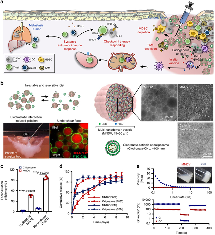 | Fig. 1. The chemotherapeutic drugs gemcitabine (GEM) and clofarabine (CNL) can be used to deplete MDSCs and TAMs, thereby restoring TIME. Synergistically enhance the immune response stimulated by tumor nanovaccines loaded with R837. In addition, combination checkpoint therapy can enhance the immune response against cancer cells. Copied with permission [61]. Copyright 2019, Springer Nature Publishing Group. | |