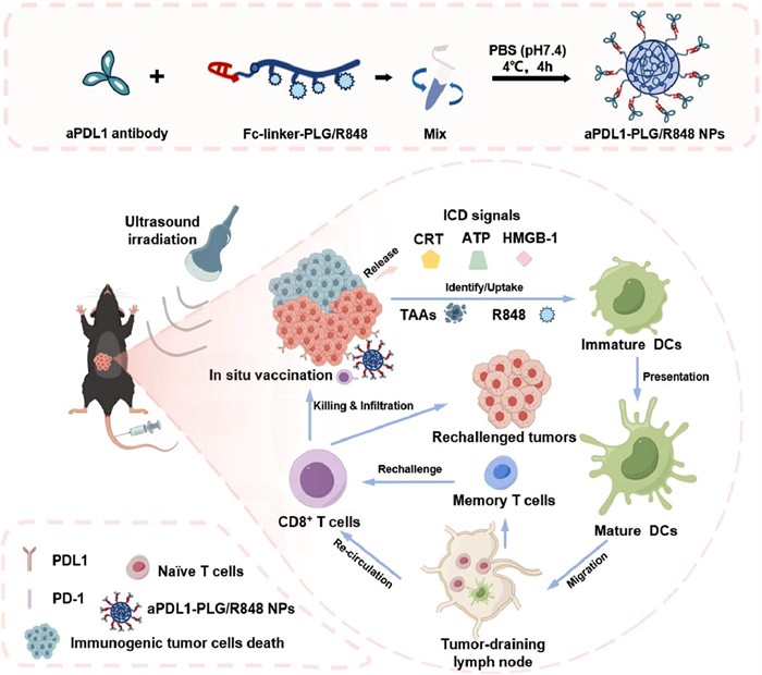 The non-invasive ultrasonic acoustic dynamics therapy (SDT) treatment has demonstrated the ability to induce antitumor immunity [125-127]. The therapeutic mechanism of SDT is mainly divided into two parts: the use of sonosensitizers and the production of highly toxic ROS, mainly singlet oxygen (1O2), which induce ICD and release abundant TAAs, thereby increasing tumor immunogenicity and promoting tumor infiltration by CTL; It kills cancer cells directly or indirectly by inhibiting the formation of new blood vessels in tumor tissue and inducing tumor-specific immunity [128]. Ultimately, this results in a tumor-specific immune response for effective eradication of cancer [129,130]. However, the single use of SDT immune efficacy to inhibit the growth of primary tumor metastasis is not particularly strong [131]. In recent years, titanium dioxide (TIO2) has been one of the most widely studied nanomaterials in SDT [132]. It has strong stability and low cytotoxicity and can also be used as an immune adjuvant and carrier of related antigens [133-135]. Based on this, researchers have used titanium dioxide to construct a nanovaccine to achieve the synergistic effect of tumor nanovaccine and SDT on primary tumors. Wang et al. constructed a multifunctional tumor nanovaccine BMT@LA NCs [136]. The BMT@LA replication exhibits vaccine-like characteristics, wherein, under the influence of ultrasonic waves, BMT and LA generate 1O2 and nitric oxide (NO) gas at the tumor site. Additionally, this process enhances cellular oxidative stress levels and induces double-stranded DNA rupture, ultimately leading to apoptosis in cancer cells. Simultaneously, tumor-related antigens stimulate antigen-specific T-cell immune responses by promoting the release of apoptotic cells. At the same time, tumor nanovaccines can also enhance the tumor-associated antigens released from tumor cells killed due to acoustic kinetic therapy, which in turn induces an immune response. For example, the nanovaccine constructed by Cui et al. based on anti-PD-L1, Fc-Ⅲ-4C peptide linker and poly(l-glutamic acid)-graft-R848 activated the in vivo immune mechanism under the dual stimulation of in situ antigen and immune adjuvant under the action of ultrasound and further induced a strong antigen-specific immunomemory effect, preventing the tumor from recurring in vivo (Fig. 4) [137].
