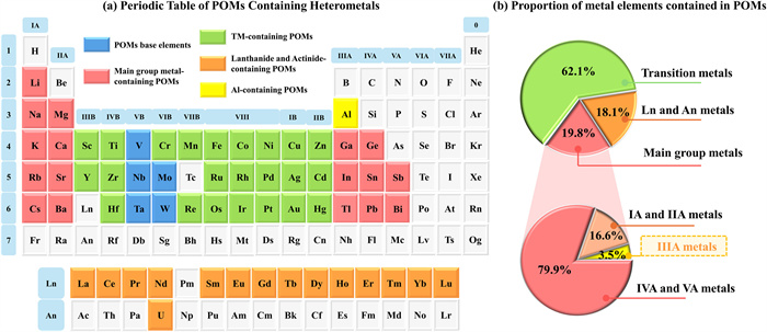 | Fig. 1. An inclusive statistical summary of all metal elements present in current POM structures. (a) A simplified periodic table analysis of the elements contained in POMs: including the base elements that form the POMs (blue), the other elements contained (the main group metals: red; the transition metals: green; the lanthanide and actinide metals: orange; and the Al element: yellow), which is the focus of this manuscript. The elements are highlighted and classified in different colors. (b) The proportion of POM structures containing various elements. | |