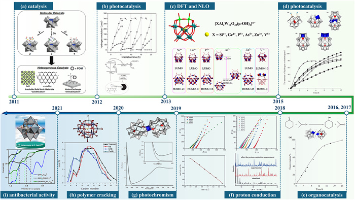 | Fig. 5. (a) A review of the application of Al-substituted di-vacant [γ-SiW10O34(H2O)2]4− in heterogeneous catalysis. Reproduced with permission [100]. Copyright 2011, Springer. (b) Photocatalytic hydrogen evolution properties of α-[AlSiW11(H2O)O39]5− materials. Reproduced with permission [49]. Copyright 2012, Elsevier. (c) Theoretical study on NLO properties of Al-POMs. Reproduced with permission [56]. Copyright 2013, Elsevier. (d) A series of Al-POM is used to produce hydrogen in visible water in a novel photocatalytic system. Reproduced with permission [51]. Copyright 2015, Springer. (e) The application of mono-aluminum-substituted dimeric silicotungstate in organic catalysis. Reproduced with permission [58,59]. Copyright 2016, 2017, Springer, Elsevier. (f) Application of {P8W48} and {Al16} in the field of proton conduction. Reproduced with permission [18]. Copyright 2018, Wiley-VCH. (g) The photochromic properties of sandwich type mono-Al-POM complexes. Reproduced with permission [66]. Copyright 2019, MDPI. (h) The catalytic performance of aluminum substituted tungstoborate for pyrolysis of polyethylene waste to petrochemical feedstock. Reproduced with permission [52]. Copyright 2020, Elsevier. (i) The antibacterial activity of aluminum-substituted Keggin germanotungstate. Reproduced with permission [53]. Copyright 2021, American Chemical Society. | |