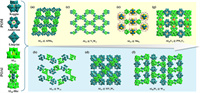 2.2.2. Al13@POMsIn fact, before the discovery of the first POMs-based ionic crystal structure in 2000, Kwon's research group had already initially explored the assembly technique of {Al13} and {V10} in the previous year and obtained the nanocomposite gel material Na0.3[AlO4Al12(OH)24(H2O)12][V10O28]Cl1.3(H2O)35.5 [85]. Building upon this, using gel crystallization technique, {Mo7} solution was slowly added to {Al13} solution to obtain {Al13} and {AlMo6} ionic single crystals with well-defined structures [AlO4Al12(OH)12(H2O)24][Al(OH)6Mo6O18]2·(OH)·29.5H2O (Fig. 4a) [78]. The authors suggested that this mode of ion stacking with certain channels could potentially play a unique role in adsorption, catalysis, and other fields. Since then, composite ionic crystals based on POMs building blocks such as Keggin, Linquist, and clusters of {Al13} have sprung up. In 2003, two cases of {δ-Al13} isolated from the fragmentation of homopolytungstates and heteropolytungstates reacting with {Al30} were constructed to form molecular ionic compounds via face-to-face hydrogen bonding interactions and electrostatic interactions. [δ-Al13O4(OH)24(H2O)12][H2W12O40](OH)·nH2O and [δ-Al13O4(OH)24(H2O)12][CoW12O40](OH)·nH2O, with pore energies of more than 40% (Fig. 4b) [86]. This face-to-face hydrogen bonding interaction was shown even more vividly in a work by Kwon immediately following [87]. In this study, octahedral Lindqvist-type [V2W4O19]4− (V2W4) clusters with truncated tetrahedral Keggin-type [ɛ-Al13O4(OH)24(H2O)12]7+ with four triangular faces that perfectly fit to maximize hydrogen bonding and electrostatic interactions, constituting a honeycomb structure with hexagonal cavities (Fig. 4c). In the following five years, porous nanocomposites of {Al13} and Anderson-type {XMo6} (X=Al3+, Co3+, Cr3+, V5+) have emerged and catalytic properties have been explored [88-90]. In 2016, Mizuno et al. also utilized {CoW12} and a novel {SiV3W9} with {ɛ-Al13} to obtain needle-type crystals and dissolution recrystallized plate-type crystals, which not only enhanced the stability of the crystals but also acted as non-homogeneous solid acid catalysts to catalyze phenol rearrangement (Fig. 4d) [91]. Very similar to it, ionic crystals of {PV3W9} and {δ-Al13} were obtained by a researcher in 2022 by synthesis, which was applied for solid catalyst performance comparison [92].