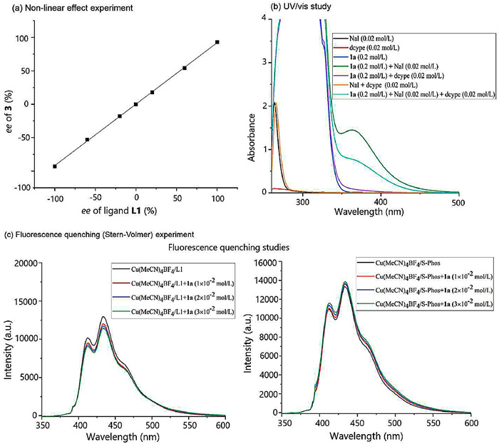 To verify this possibility, the fluorescence quenching experiments were conducted and the results showed that the mixture of Cu and nitrogen ligand in DMAc exhibited an obvious absorption in the UV–vis region (400~500 nm), and the resulting emission of the photoexcited Cu(L1)* complex can be quenched by the addition of the NHPI ester, while no emission quenching observed when adding NHPI ester to the photoexcited Cu/S-Phos complex (Fig. 1c). This result indicated that the Cu/L1 complex might be a photoactive species, which absorbs visible light to reach its excited state and facilitates the electron transfer from the excited Cu(L1)* complex to the NHPI ester. Due to this reason, a little access amount of Cu is added to offset this partial consumption, thus ensuring the high reactivity and stereoselectivity.